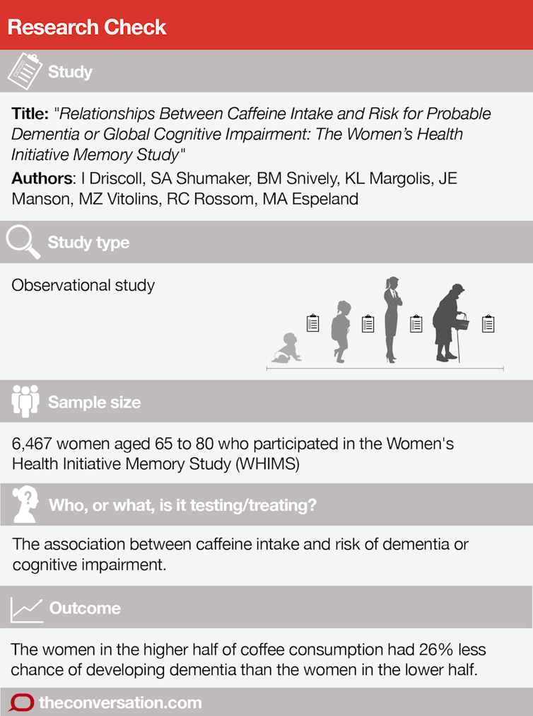 The researchers concede several reasons for caution. For a start, this study only looked at older women. They mention another study from France that found coffee had a protective effect on women but not men. And a third study found European men who drank three cups of coffee per day had the lowest rate of cognitive decline over ten years.